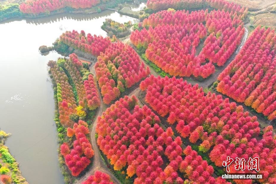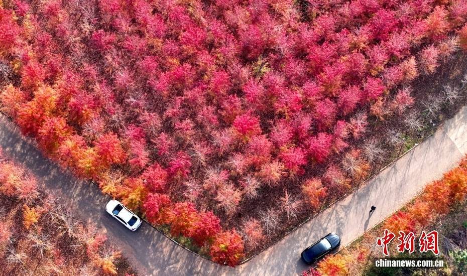 游客在河北邯郸峰峰矿区义井镇万亩秀林游玩。金秋时节,万亩秀林内的红枫由绿转红,“枫”景迷人,吸引游客前来观赏。(无人机照片)图/CNSphoto 郝群英 摄